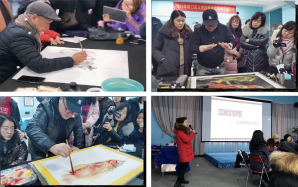 我们在静静的听与看的过程中,感受到了李颖婷老师为我们带来的美轮美奂的中国工笔画艺术之美;静静地观看邵昱皓教授为我们演示的水彩画技法,感受水彩画的水润浸染;还有叶军教授带来的中国画的写意传神,还有李玲老师带来的纸艺趣味创新等等。这些丰富的美术表现形式带给我们不同的美感。我们拿起了剪刀,在完成了一件又一件的有趣的纸艺作品过程中,我们仿佛回到了儿时的课堂。我们拿起了细细的毛笔,感受了久违的白描。拿起毛刷,试着像水彩教授那样刷上几笔,水彩的自然融合展现在我们的面前。在教授的指导下,完成了一幅畅快淋漓的中国画。在这样动静结合的过程中,我们感受体会了各种美术表现形式的技能技法。我们还能感受到老师们对艺术创新的不断探索精神,让我们不仅提高了眼界,更带动了我们手的,触动了我们心底对美术更高境界的向往。