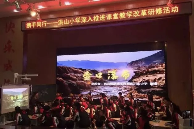 第一节课,洪山小学陈曦老师带领六(4)班学生为我们展示了《壶口瀑布》一文的教授过程。陈曦老师以李白的《望庐山瀑布》开篇,并以地图展示黄河的全貌及壶口瀑布的位置,学生如临其境,带着问题开始独学。学生组内交流后小组汇报展示交流成果,教师在小组汇报的基础上揭示壶口瀑布的特点,并以壶口瀑布视频和配乐朗诵,让学生更好感受作者是怎样描写壶口瀑布的特点。